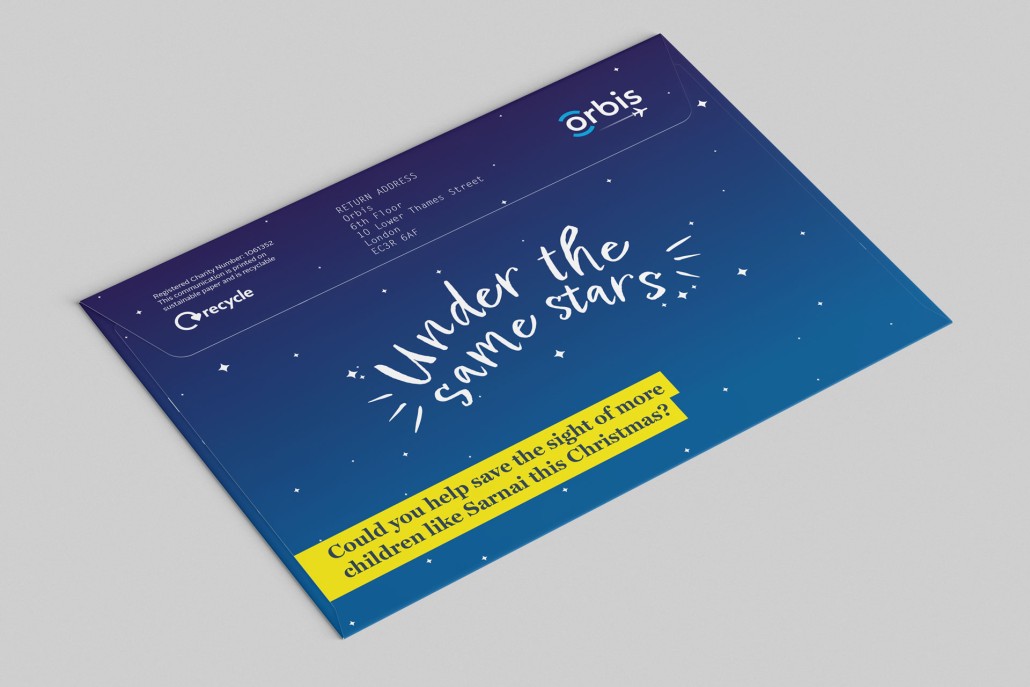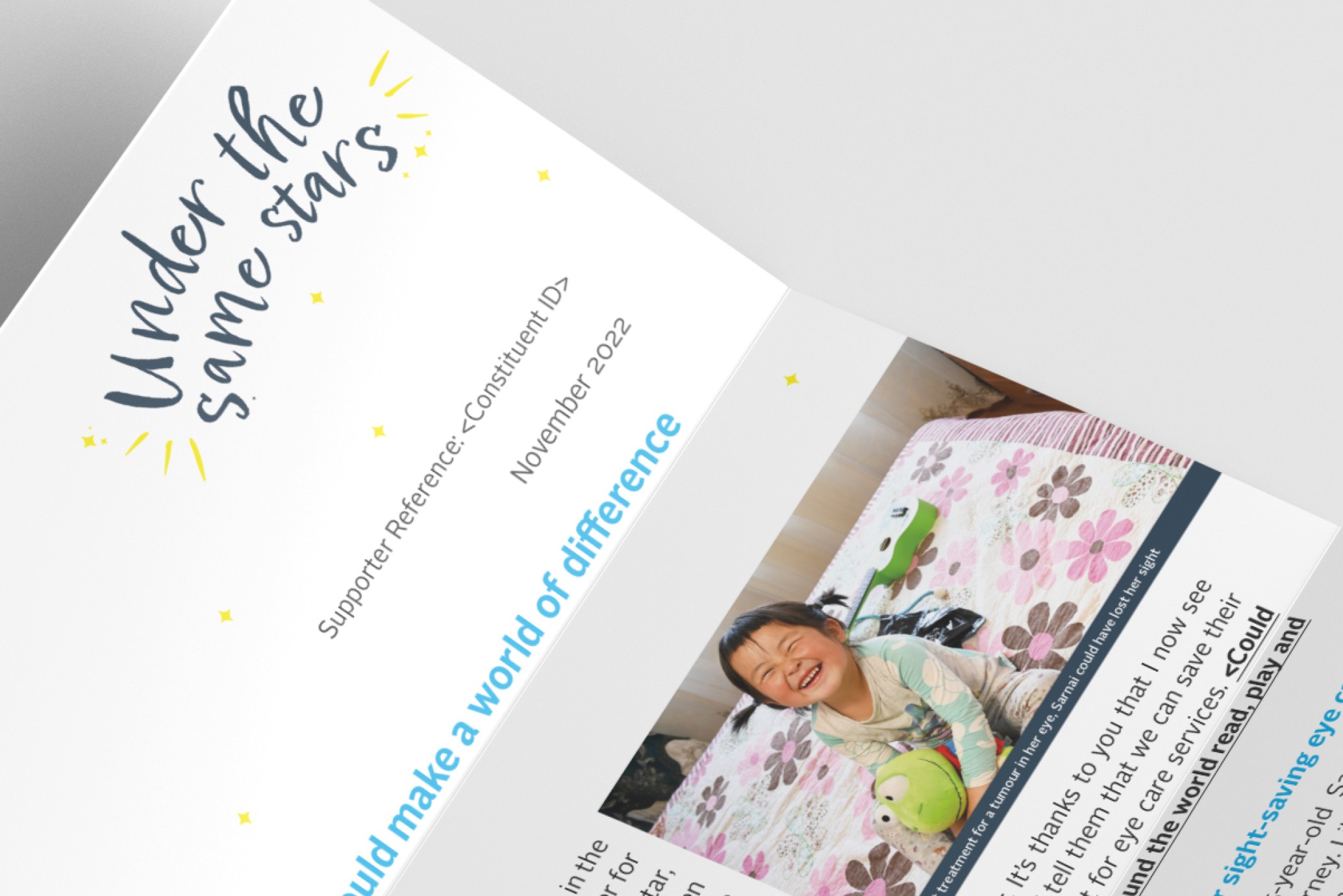 Our creative concept, "Under the Same Stars," evoked empathy for children in both the UK and wintery Mongolia. Accompanied by a cut-out star for supporters' children, it emphasized universal emotions tied to Christmas and winter. Sarnai's story highlighted the challenges faced by nomadic families, illustrating the urgent need for funds to ensure access to specialized eye care. The campaign showcased Cybersight's global impact, aligning with Orbis's brand proposition, "Eye Care Everywhere." The reminder mailer featured a stripped-back design, conveying a sense of urgency with the copy line "It's not too late."