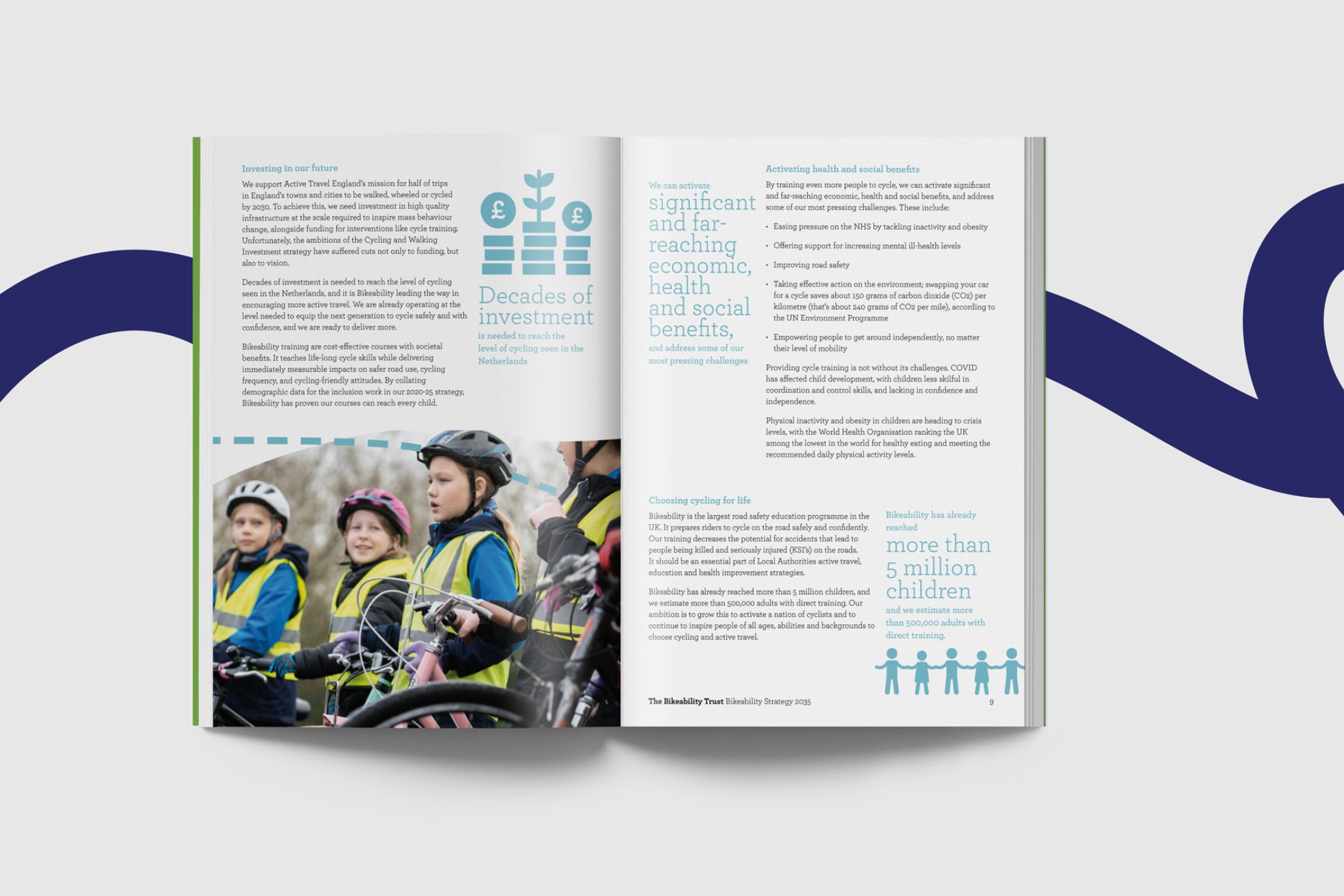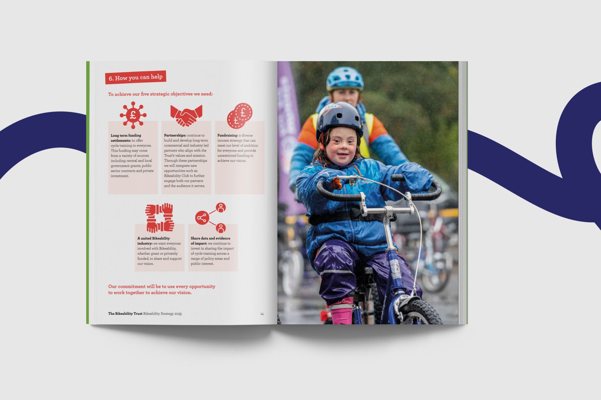 Bikeability asked us to copy write their strategy document into a clear, one-page summary that shows their goals for the next ten years, from 2025 to 2035.