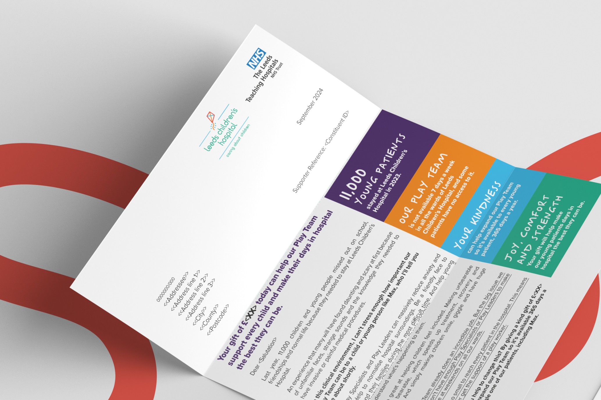 We created the appeal to highlight the lack of year-round play at Leeds Children’s Hospital as a pressing social issue. The messaging framed this gap as a fundamental right that children were missing out on, encouraging supporters to see the current situation as something that needed to be changed. Through a double-sided letter and leaflet, we made it clear that their donations could directly help ensure that play was available 365 days a year. The tone was intentionally campaign-like, aiming to both raise awareness and empower supporters to take action, with tangible examples of how their contributions could make a real difference.