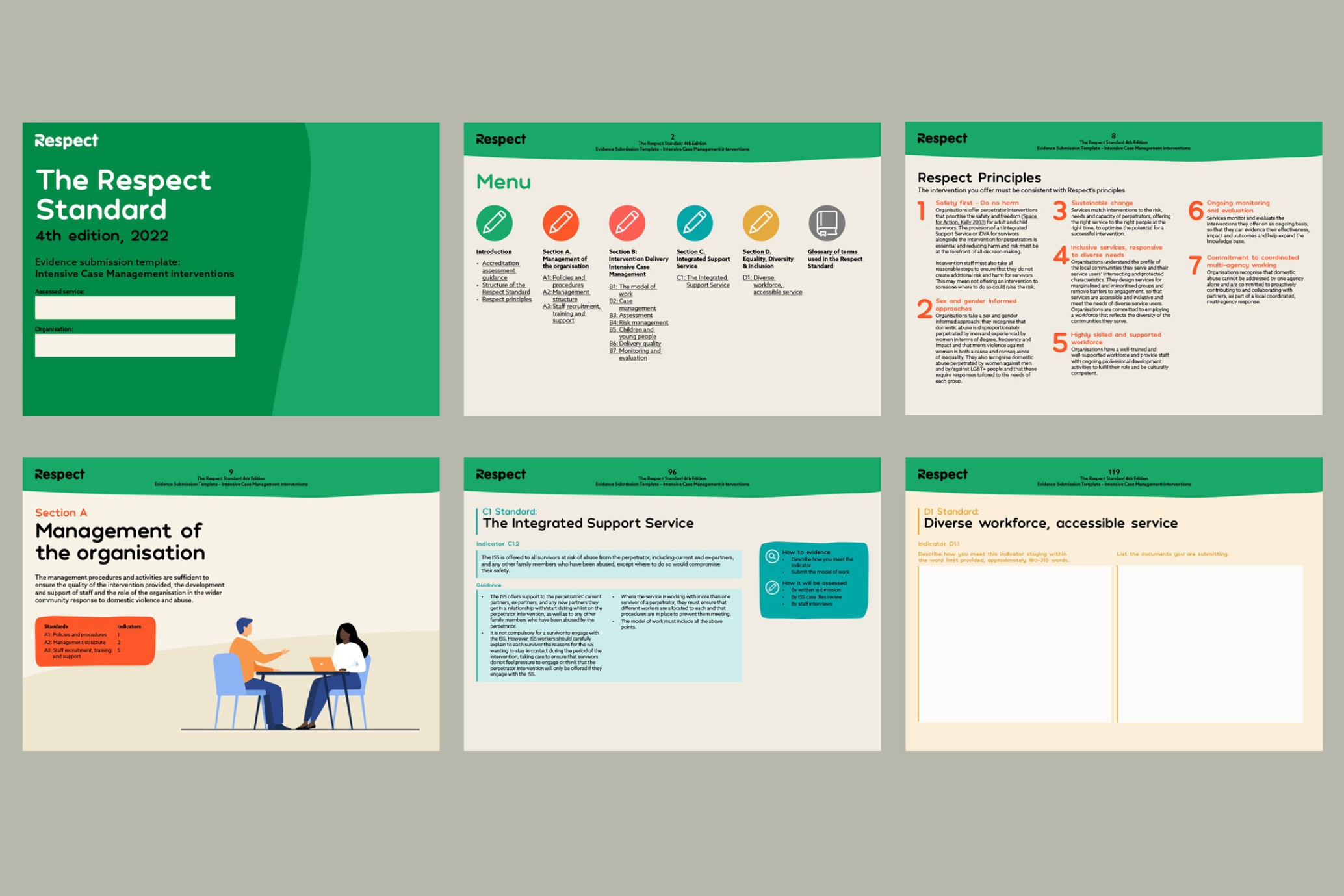 Revamp the 4th edition of Respect’s Accreditation Standard. There were two digital documents: one for the main publication, which needed the standards updating in a clear and easy to use fashion, and another for evidence submission, which would deliver applications to assessors in a clear and logical way. Both had to be accessible and screen reader-friendly, with hyperlinked content throughout.