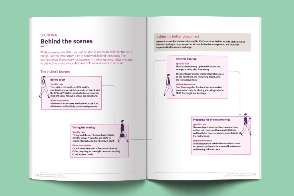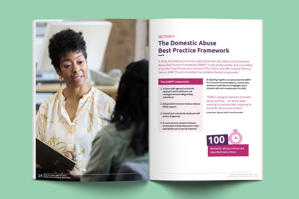 We were tasked with crafting a report intended for sharing the Specialist Domestic Abuse Courts model and highlighting the collaborative efforts of Standing Together with their partner services. Despite budget constraints, careful consideration was given to imagery due to the sensitive nature of the subject, ensuring a thoughtful and impactful presentation.