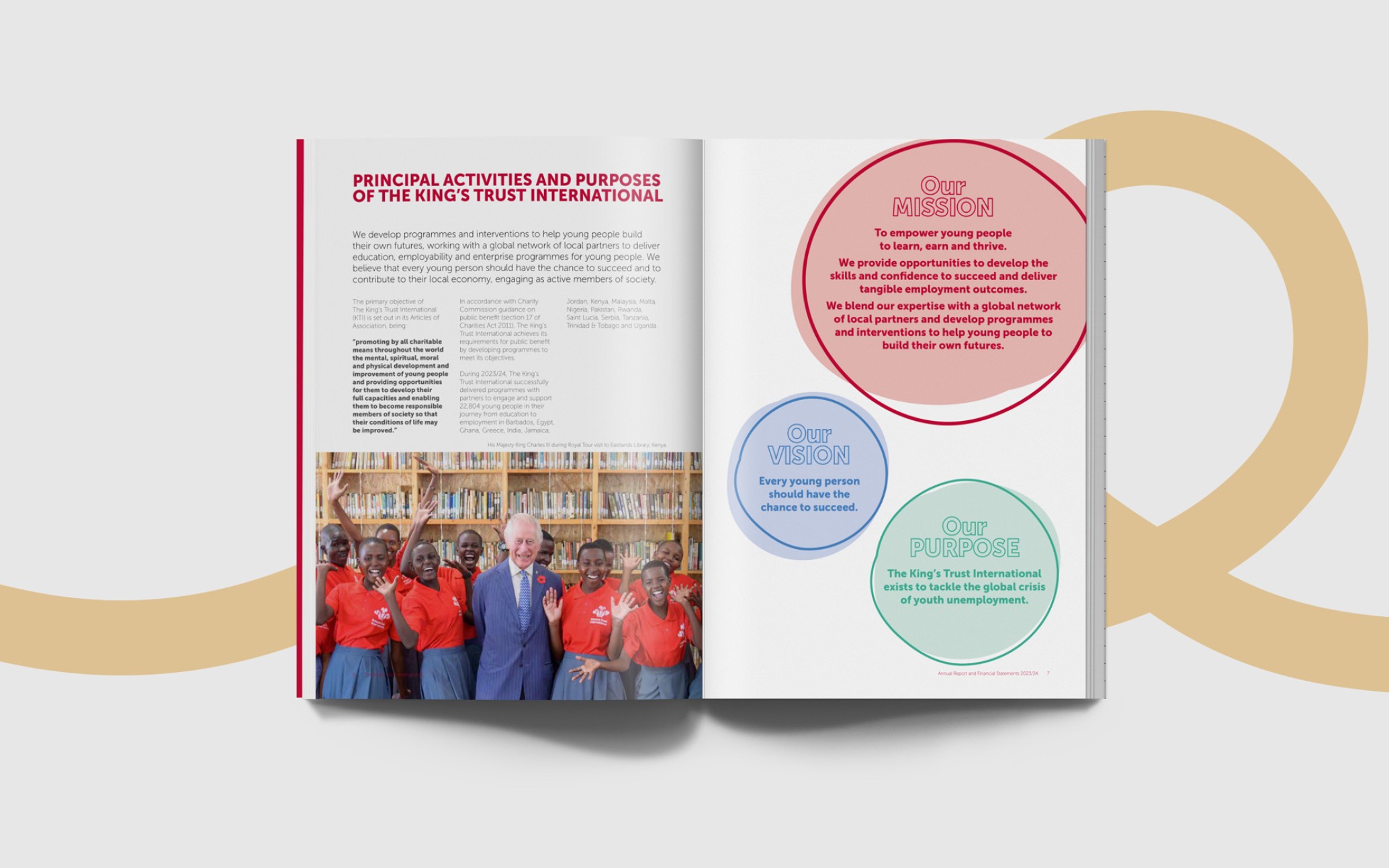 We were asked to complete the 2023/24 annual report for The King’s Trust International, using the same layout and design as last year’s report for The Prince’s Trust International. This approach will ensure consistency in style and branding, while showcasing The King’s Trust’s achievements, financials, and impact over the past year as the brand transitions.